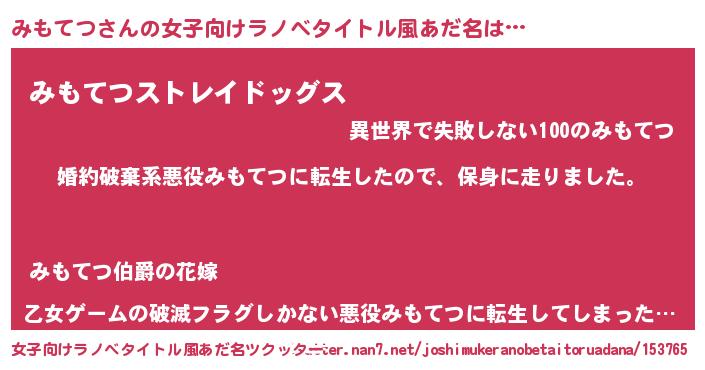 | 男性向けラノベタイトル風あだ名 | 『ミモテツスレイヤー』 |