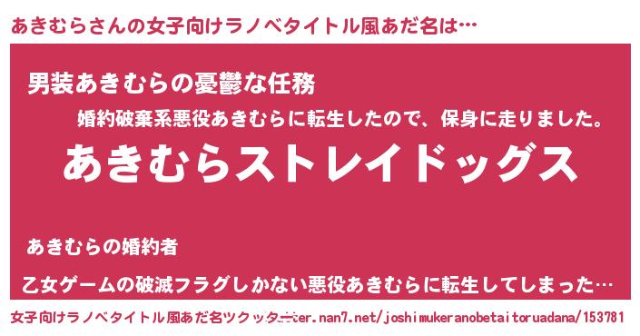 | 男性向けラノベタイトル風あだ名 | 『Re:あきむらから始める異世界生活』 |