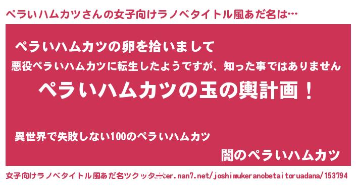 | 男性向けラノベタイトル風あだ名 | 『転生したらペラいハムカツだった件』 |