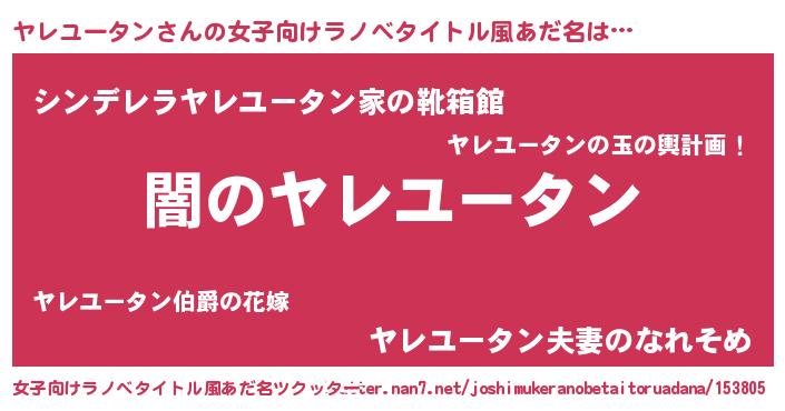 | 男性向けラノベタイトル風あだ名 | 『Re:ヤレユータンから始める異世界生活』 |