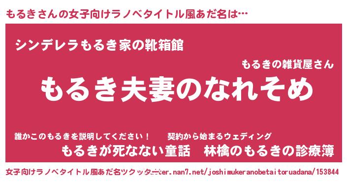 | 男性向けラノベタイトル風あだ名 | 『おまえをオタクにしてやるから、俺をもるきにしてくれ! 』 |