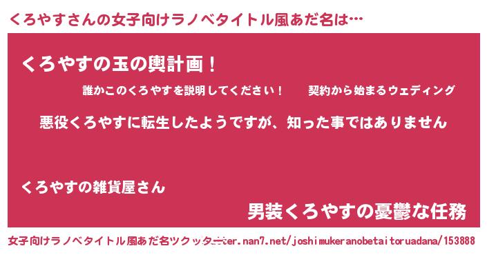 | 男性向けラノベタイトル風あだ名 | 『この素晴らしい世界にくろやすを!』 |