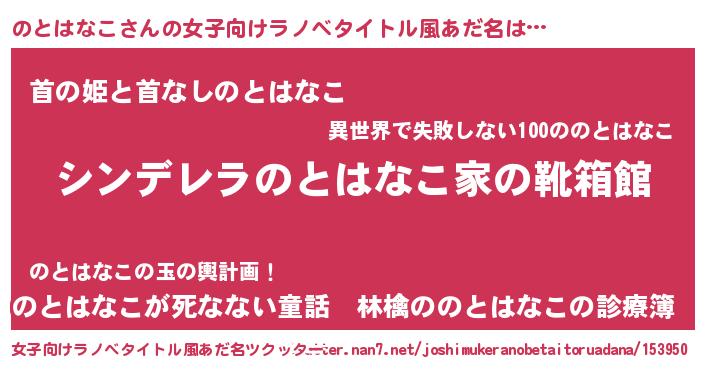 のとはなこさんの女子向けラノベタイトル風あだ名は… 『シンデレラのとはなこ家の靴箱館』『首の姫と首なしのとはなこ』『のとはなこが死なない童話 林檎ののとはなこの診療簿』 ツクッター #女子向けラノベタイトル風あだ名ツクッター http://tkutter.nan7.net/joshimukeranobetaitoruadana/153950/