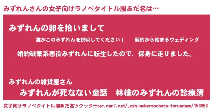 | 胡散臭い通販商品みたいなあだ名 | 『信頼と実績のサプリメント…その名も「みずれん」』 |