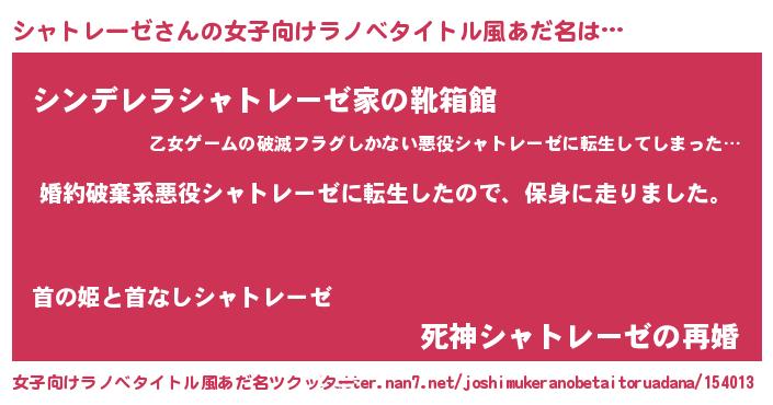 シャトレーゼさんの女子向けラノベタイトル風あだ名は… 『婚約破棄系悪役シャトレーゼに転生したので、保身に走りました。』『シンデレラシャトレーゼ家の靴箱館』『死神シャトレーゼの再婚』 ツクッター #女子向けラノベタイトル風あだ名ツクッター http://tkutter.nan7.net/joshimukeranobetaitoruadana/154013/
