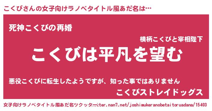 | 男性向けラノベタイトル風あだ名 | 『ダンジョンにこくびを求めるのは間違っているだろうか』 |