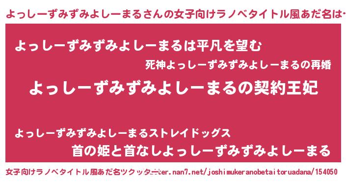 | 男性向けラノベタイトル風あだ名 | 『よっしーずみずみよしーまるという概念が存在しない退屈な世界 』 |