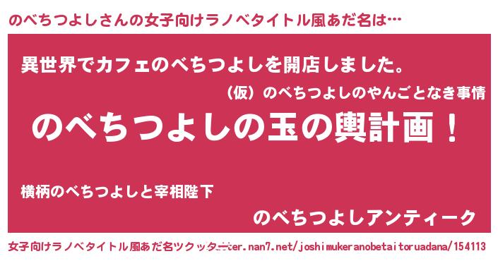 | 男性向けラノベタイトル風あだ名 | 『のべちつよし~年齢イコール彼女いない歴の魔法使い~』 |