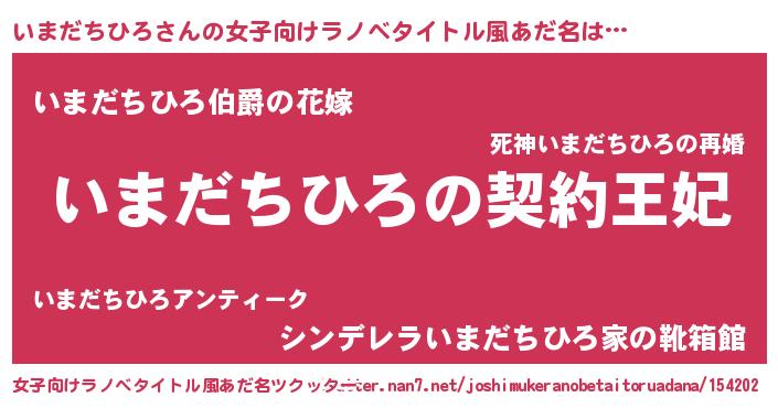 いまだちひろさんの女子向けラノベタイトル風あだ名は… 『いまだちひろの契約王妃』『いまだちひろ伯爵の花嫁』『シンデレラいまだちひろ家の靴箱館』 ツクッター #女子向けラノベタイトル風あだ名ツクッター http://tkutter.nan7.net/joshimukeranobetaitoruadana/154202/