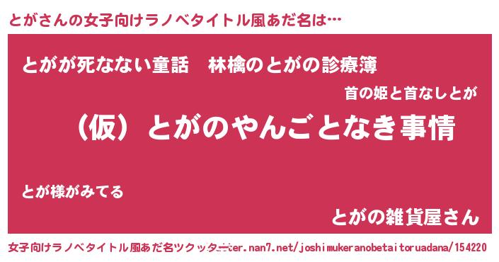 | 男性向けラノベタイトル風あだ名 | 『とがの憂鬱』『魔弾の王ととが』 |