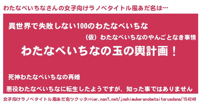 | 男性向けラノベタイトル風あだ名 | 『わたなべいちな~年齢イコール彼女いない歴の魔法使い~』 |