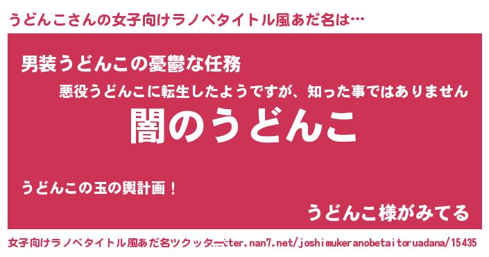 | 男性向けラノベタイトル風あだ名 | 『Re:うどんこから始める異世界生活』 |