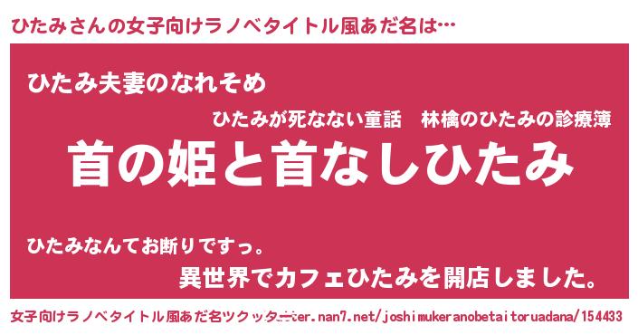 ひたみさんの女子向けラノベタイトル風あだ名は… 『首の姫と首なしひたみ』『ひたみ夫妻のなれそめ』『異世界でカフェひたみを開店しました。』 ツクッター #女子向けラノベタイトル風あだ名ツクッター http://tkutter.nan7.net/joshimukeranobetaitoruadana/154433/