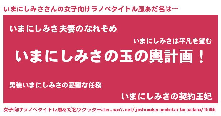 | 男性向けラノベタイトル風あだ名 | 『いまにしみさ~年齢イコール彼女いない歴の魔法使い~』 |