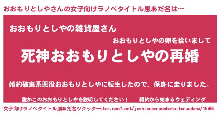 | 男性向けラノベタイトル風あだ名 | 『ノーゲーム・ノーオオモリトシヤ』 |