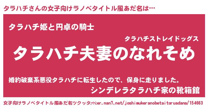 | 男性向けラノベタイトル風あだ名 | 『おまえをオタクにしてやるから、俺をタラハチにしてくれ! 』 |