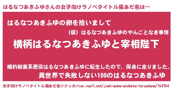 | 男性向けラノベタイトル風あだ名 | 『はるなつあきふゆに滅ぼされるだけの簡単なお仕事です』 |