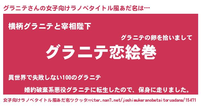| 男性向けラノベタイトル風あだ名 | 『おまえをオタクにしてやるから、俺をグラニテにしてくれ! 』 |