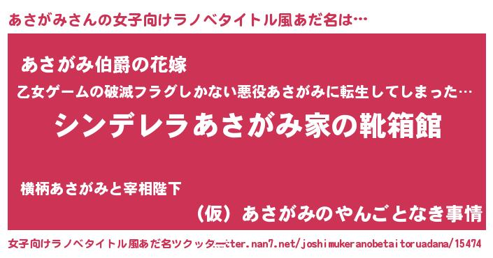 | 男性向けラノベタイトル風あだ名 | 『緋弾のアサガミ』『あさがみの憂鬱』 |