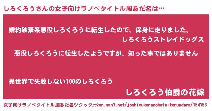 | 男性向けラノベタイトル風あだ名 | 『この素晴らしい世界にしろくろうを!』 |
