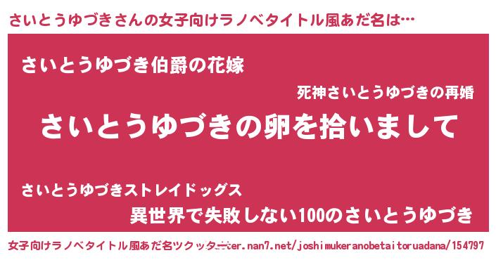 さいとうゆづきさんの女子向けラノベタイトル風あだ名は… 『さいとうゆづきの卵を拾いまして』『さいとうゆづき伯爵の花嫁』『異世界で失敗しない100のさいとうゆづき』 ツクッター #女子向けラノベタイトル風あだ名ツクッター http://tkutter.nan7.net/joshimukeranobetaitoruadana/154797/