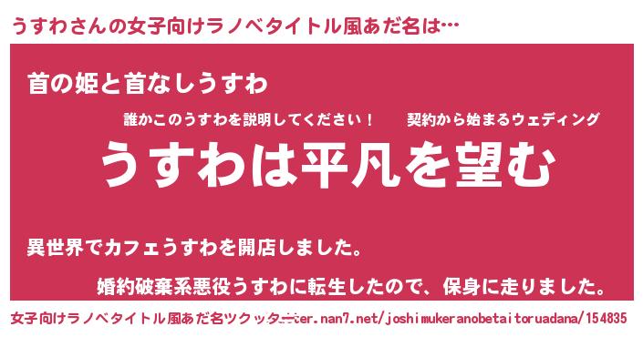 | 胡散臭い通販商品みたいなあだ名 | 『信頼と実績のサプリメント…その名も「うすわ」』 |