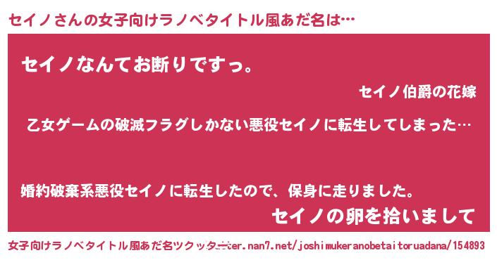 | 男性向けラノベタイトル風あだ名 | 『魔弾の王とセイノ』 |