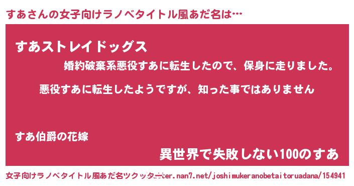 | 男性向けラノベタイトル風あだ名 | 『この素晴らしい世界にすあを!』 |