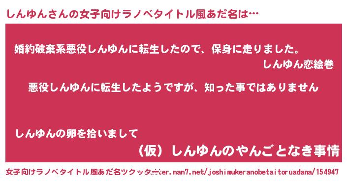 | 男性向けラノベタイトル風あだ名 | 『この素晴らしい世界にしんゆんを!』 |