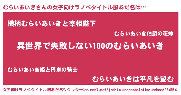 | 男性向けラノベタイトル風あだ名 | 『むらいあいきという概念が存在しない退屈な世界 』 |
