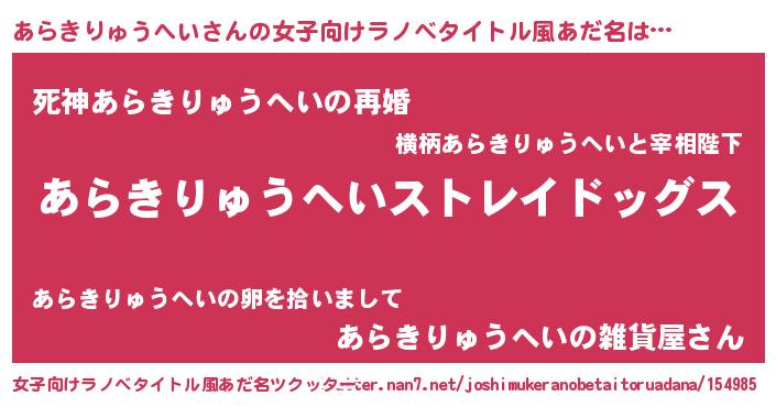 | 男性向けラノベタイトル風あだ名 | 『Re:あらきりゅうへいから始める異世界生活』 |