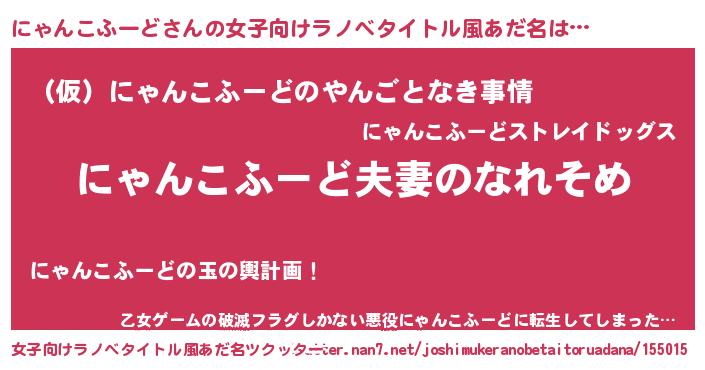 | 男性向けラノベタイトル風あだ名 | 『おまえをオタクにしてやるから、俺をにゃんこふーどにしてくれ! 』 |