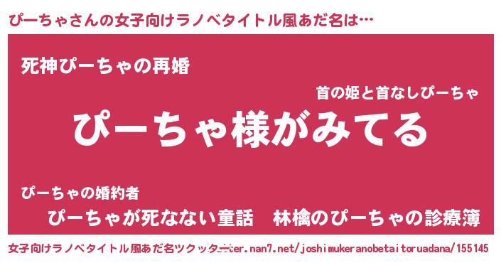 | 男性向けラノベタイトル風あだ名 | 『ぴーちゃの嫁は女の子じゃないと思った?』 |