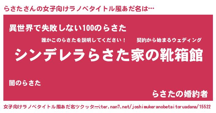| 胡散臭い通販商品みたいなあだ名 | 『絶対に幸福をもたらす水素水…その名も「らさた」』 |