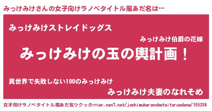 | 男性向けラノベタイトル風あだ名 | 『みっけみけ~年齢イコール彼女いない歴の魔法使い~』 |