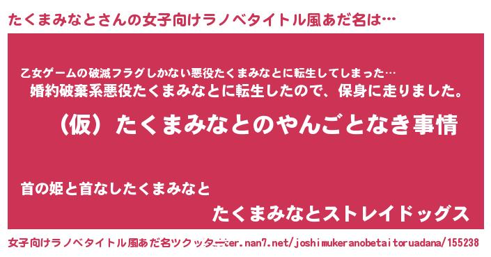 | 胡散臭い通販商品みたいなあだ名 | 『必ず成功するブレスレット…その名も「たくまみなと」』 |