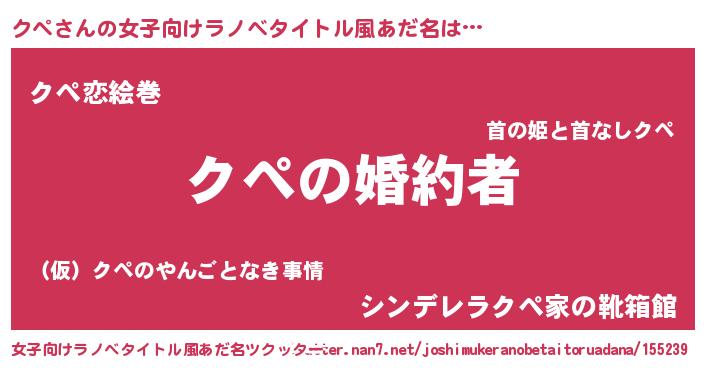クペさんの女子向けラノベタイトル風あだ名は… 『クペの婚約者』『クペ恋絵巻』『シンデレラクペ家の靴箱館』 ツクッター #女子向けラノベタイトル風あだ名ツクッター http://tkutter.nan7.net/joshimukeranobetaitoruadana/155239/