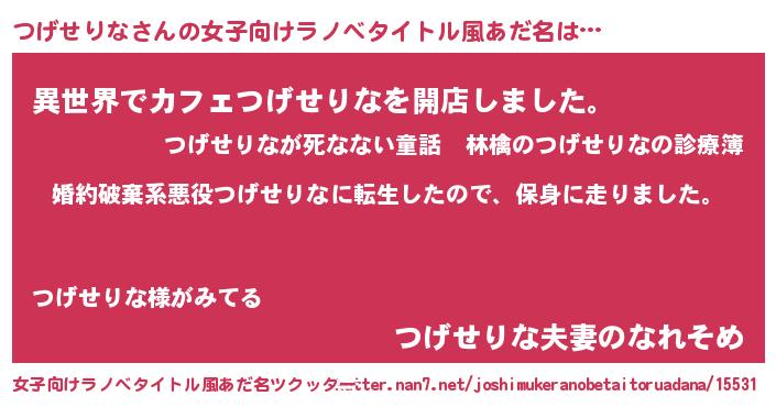 | 男性向けラノベタイトル風あだ名 | 『転生したらつげせりなだった件』 |