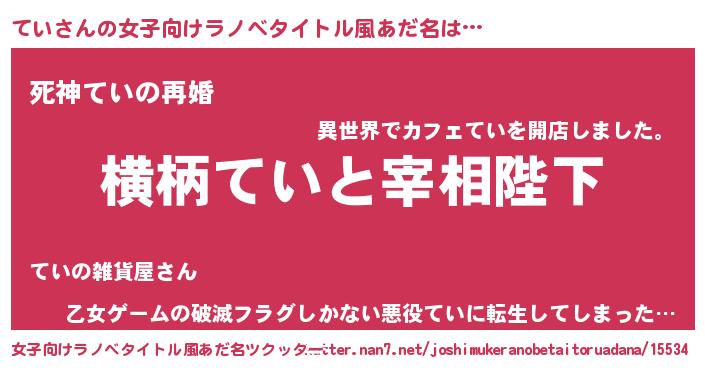 ていさんの女子向けラノベタイトル風あだ名は… 『横柄ていと宰相陛下』『死神ていの再婚』『乙女ゲームの破滅フラグしかない悪役ていに転生してしまった…』 ツクッター #女子向けラノベタイトル風あだ名ツクッター http://tkutter.nan7.net/joshimukeranobetaitoruadana/15534/