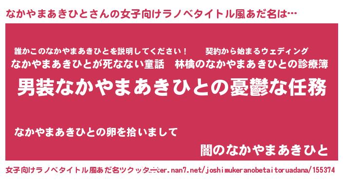 | 男性向けラノベタイトル風あだ名 | 『うちのなかやまあきひとが世界を掌握している!』 |