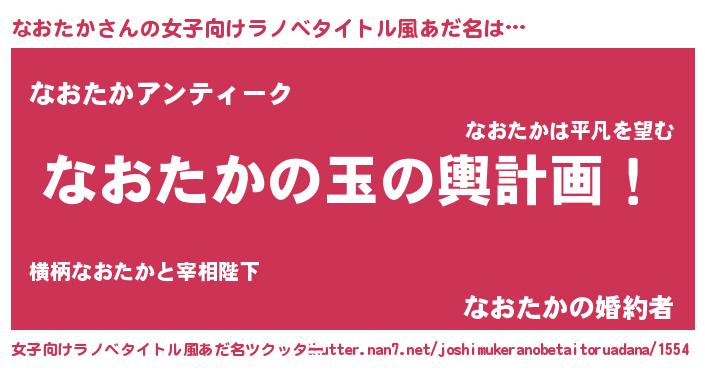 | 男性向けラノベタイトル風あだ名 | 『なおたか~年齢イコール彼女いない歴の魔法使い~』 |