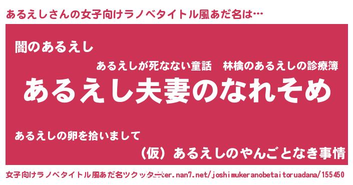 | 男性向けラノベタイトル風あだ名 | 『おまえをオタクにしてやるから、俺をあるえしにしてくれ! 』 |