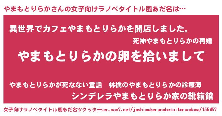 | 男性向けラノベタイトル風あだ名 | 『やまもとりらかの嫁は女の子じゃないと思った?』 |