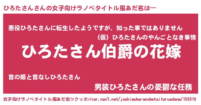 | 男性向けラノベタイトル風あだ名 | 『うちの娘の為ならば、俺はもしかしたらひろたさんも倒せるかもしれない。』 |