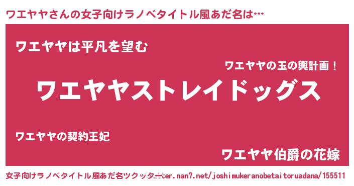 | 男性向けラノベタイトル風あだ名 | 『Re:ワエヤヤから始める異世界生活』 |