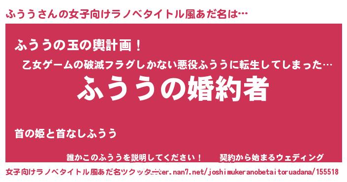 | 男性向けラノベタイトル風あだ名 | 『うちの娘の為ならば、俺はもしかしたらふううも倒せるかもしれない。』 |