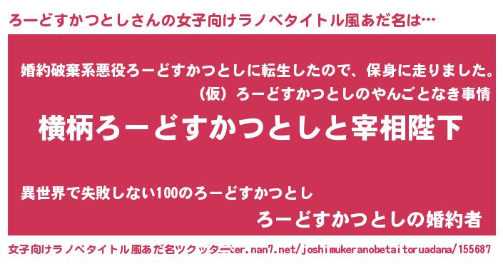 | 男性向けラノベタイトル風あだ名 | 『ろーどすかつとしに滅ぼされるだけの簡単なお仕事です』 |