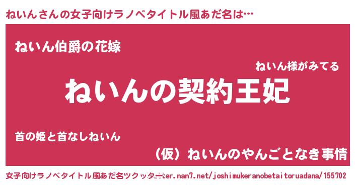 ねいんさんの女子向けラノベタイトル風あだ名は… 『ねいんの契約王妃』『ねいん伯爵の花嫁』『(仮)ねいんのやんごとなき事情』 ツクッター #女子向けラノベタイトル風あだ名ツクッター http://tkutter.nan7.net/joshimukeranobetaitoruadana/155702/