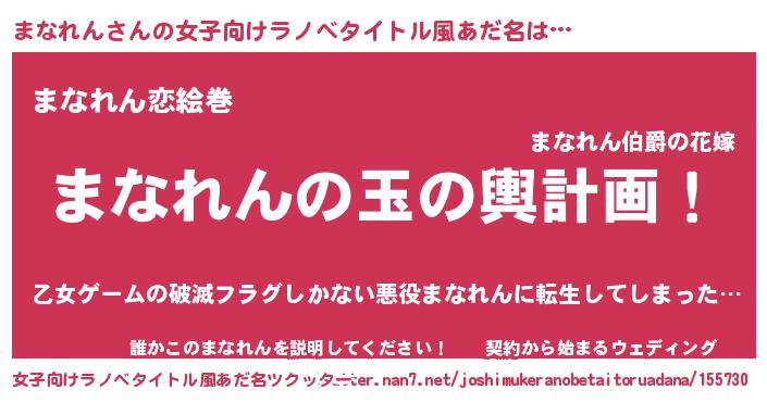 | 男性向けラノベタイトル風あだ名 | 『まなれん~年齢イコール彼女いない歴の魔法使い~』 |