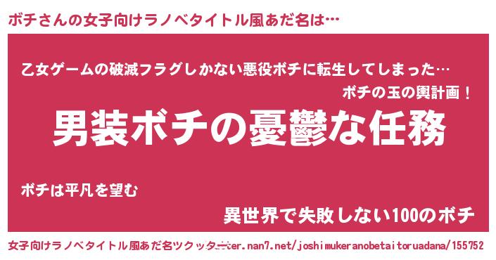 | 男性向けラノベタイトル風あだ名 | 『うちのボチが世界を掌握している!』 |